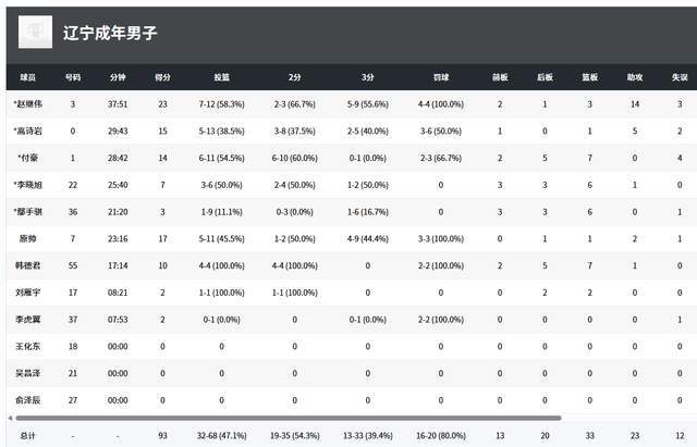 从数据来看,辽宁队5人得分上双,赵继伟12投7中,砍下23分3篮板14助攻3抢断,高诗岩13投5中,拿到15分5助攻,付豪14分6篮板,原帅17分2助攻,韩德君10分7篮板。